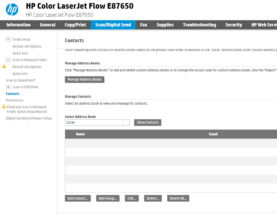 3. Click the “Scan/Digital Send” tab at the top and then, in the left column, click “Contacts”. Scroll to the bottom of the screen and under “Manage Contacts” the local address book should be selected. Click “Add Contact” to add a new user or select the existing user and click “Delete” to remove them.