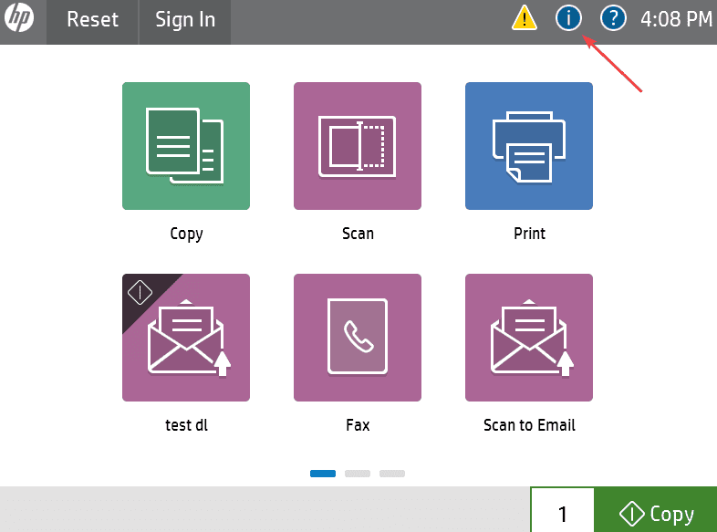 1. Go to the physical copier and press the blue “i” icon at the top of the screen, then press “Ethernet” find the “IP Address” and write it down.
