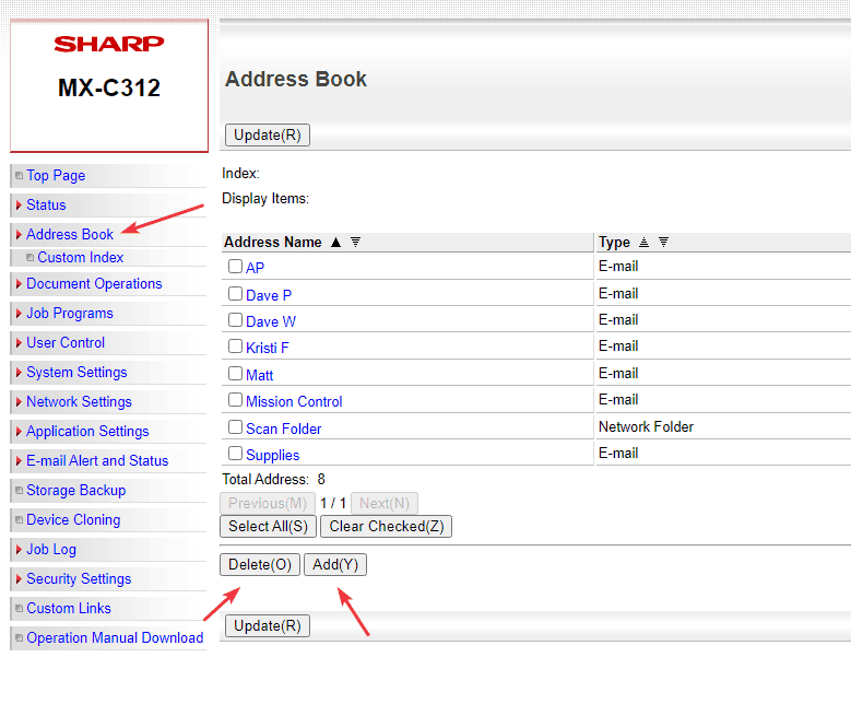 3. You will get a webpage that looks similar to this and on the left-hand side you should see “Address Book”. Click this option and then you can check the box next to the users you would like to edit/delete or at the bottom, there is an “Add” button that will allow you to create a new entry. Once you are finished you can close out of the webpage.
