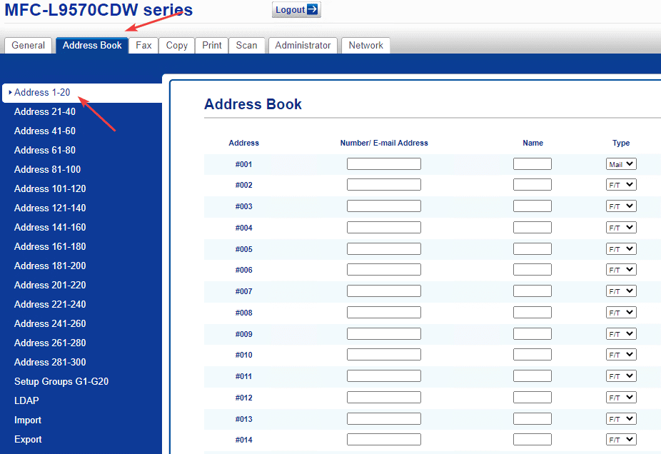 4. Once you are logged in as admin, click the “Address Book” tab at the top of the screen. Select the correct range you want to edit or add.