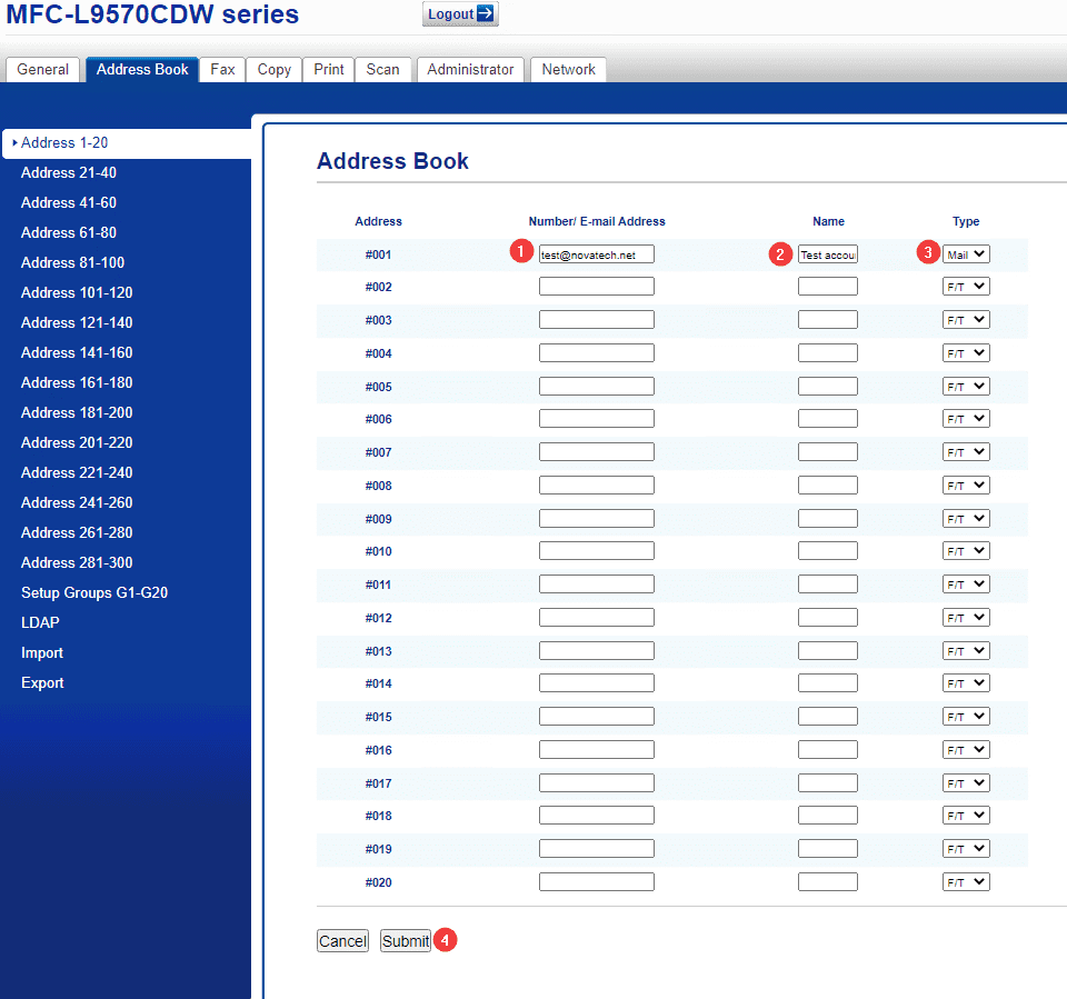 5. Here you can find an open entry in the list and add the user’s email address and name, and then drop down the type to mail. Once you have added and edited what you want, click “Submit” at the bottom to complete the changes. If you want to add fax numbers, you put the number in the first box, and then in the “Type” drop-down make sure it is set to “F/T”.