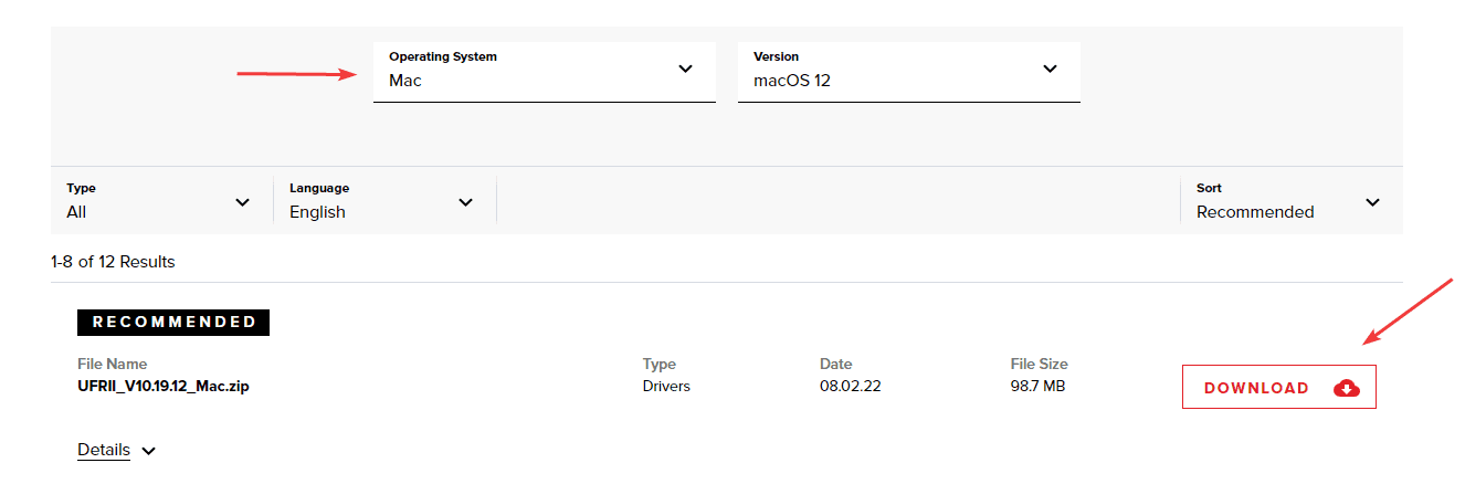 2. Make sure the correct OS is selected and then find and download the “UFRII_V_Mac.zip” driver.