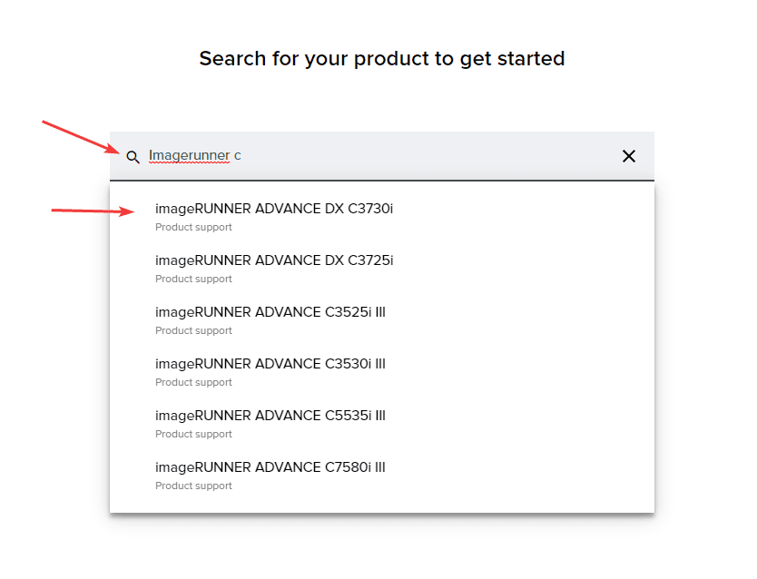 1. Navigate to the Canon support page, search for your printer model in the search bar and select it from the list of results.