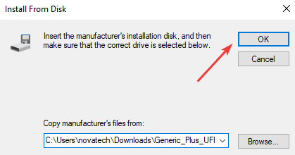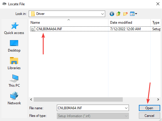 14. Find the extracted folder “Generic_Plus_UFRII” and open it, then open the “Driver” folder and click the file and then click “Open”.
