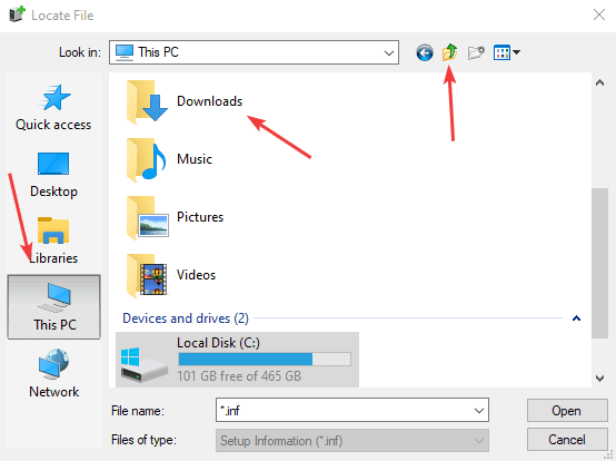18. If you have a column on the left, click “This PC”, otherwise click the green up arrow until you get to “This PC” in the dropdown menu at the bottom and then open the downloads folder.