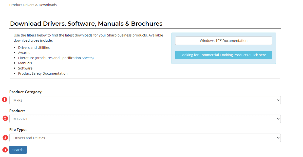 1. Navigate to the Sharp support page.