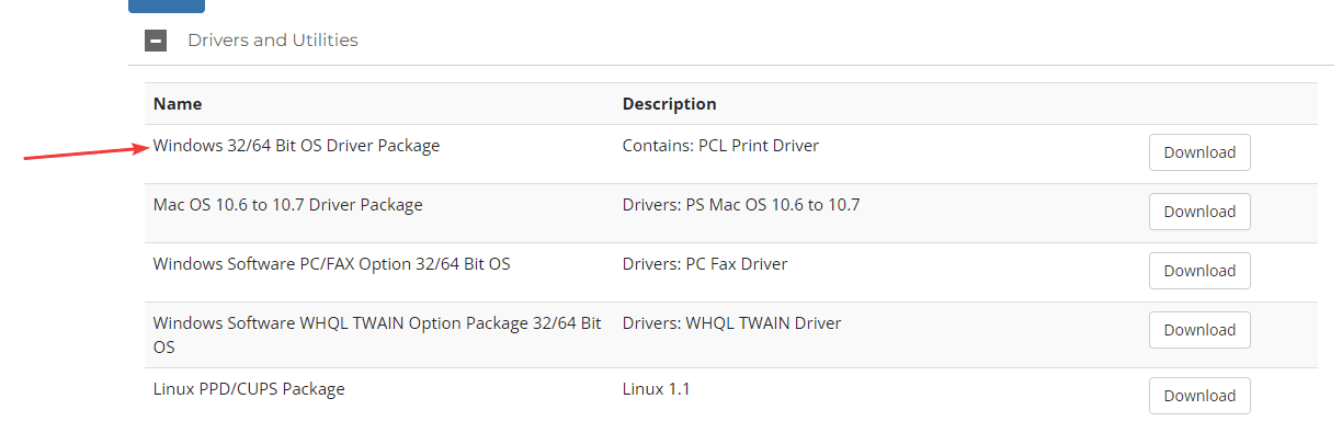 3. In the list below look for “Windows 32/64 Bit OS Driver Package” and click the “Download” button.