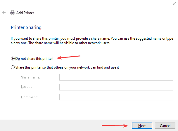 24. Click the “Do not share this printer” option and click “Next”. Notice that some versions of windows will not have this window. If you don’t get it just move to the next step.