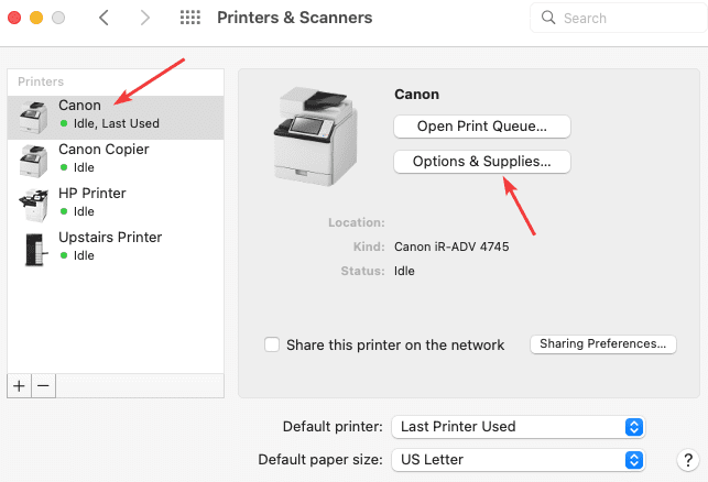 3. Find the Canon printer in the list and click it, then click “Options & Supplies”.