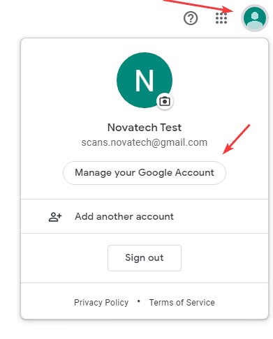 5. Click the color circle in the top right with the letter and click “Manage your Google Account”.