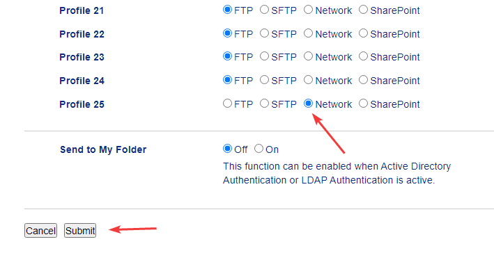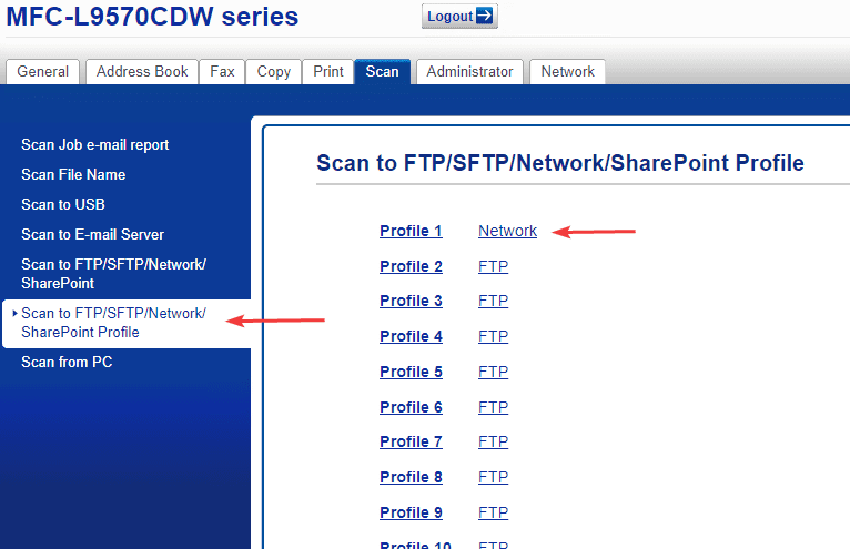 15. Now press the “Scan to FTP/SFTP/Network/SharePoint Profile” option in the left-hand column. Find the profile you chose and click it. For example, we chose “Profile 1” and you can see, it is set to “Network”.
