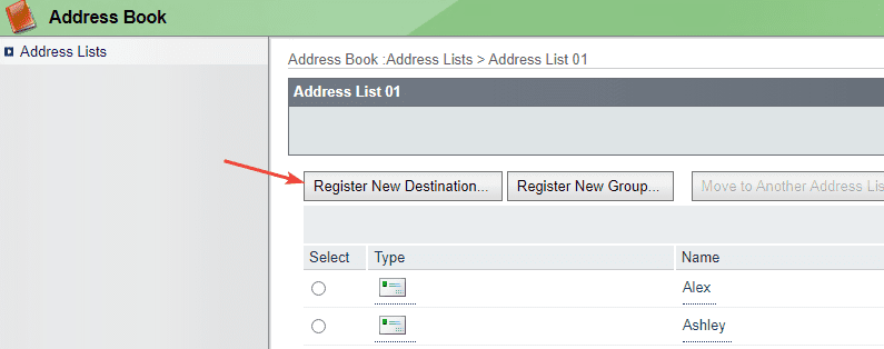 15. You will either get a “Register New Destination” button at the top or be able to click a blank entry with a number to create a new entry to the address book.