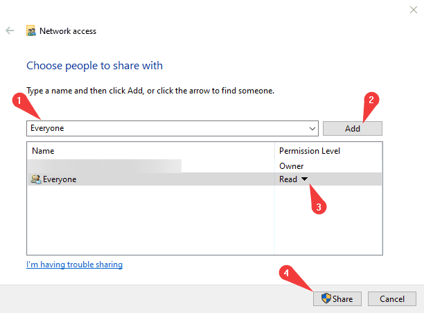 5. In the drop-down at the top, choose “Everyone” from the list and click “Add”. Then, at the “Permissions Level”, click the down arrow and select “Read/Write” and then click “Share”.