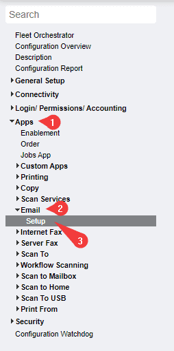 4. Click “Apps” in the left column and then click “Email” and then “Setup”.