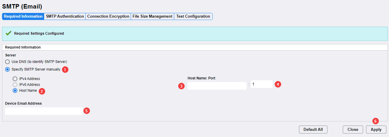 6. Select the option “Specify SMTP Server Manually” and then select “Hostname” fill out the server’s hostname and port and then type the email address you would like to use and then click “Apply”. If you don’t know the hostname and port, you can reference the chart below or reach out to your IT department.