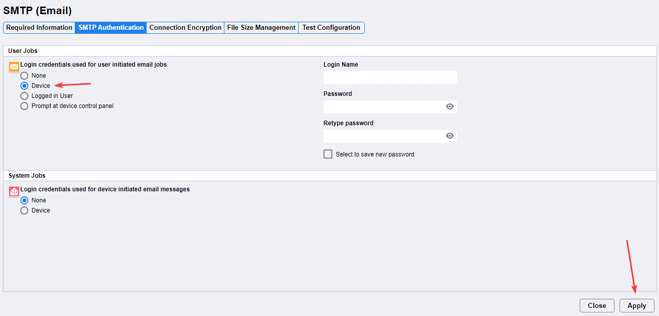 7. Click the “SMTP Authentication” tab. If your server requires authentication, click the “Device” option under the “User Jobs” section and input the email address and password and then click “Apply”.
