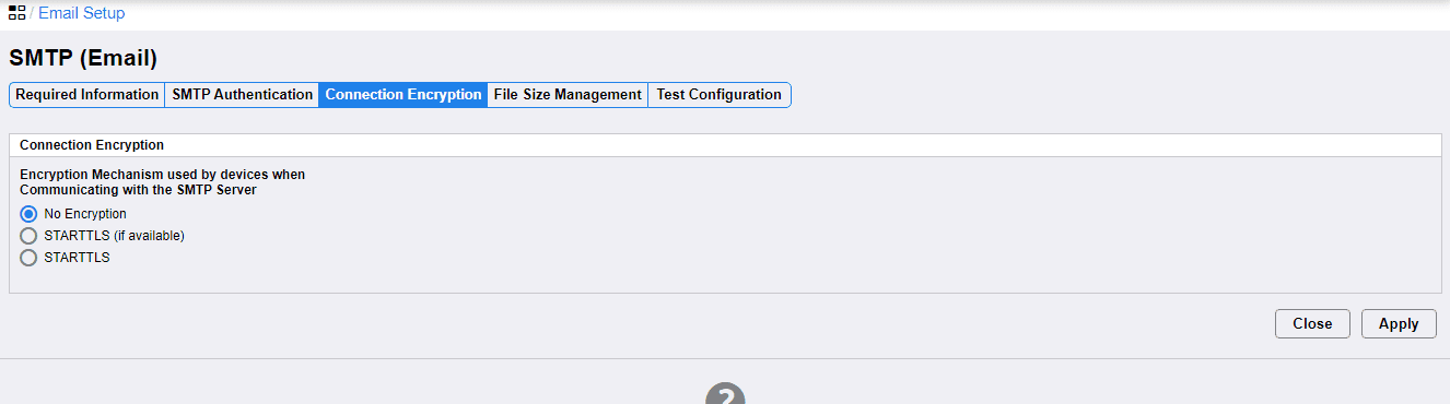 8. Click the “Connection Encryption” tab. If your server requires encryption, choose the option below and then click “Apply” and then click “Close”. If you don’t have this information, you can reference the chart above or contact your IT department.