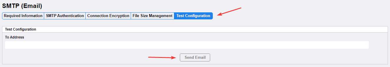 11. If you want to test the scanning feature on the webpage, click “Edit” next to “SMTP” and then click the “Test Configuration” tab, input an email address, and click “Send Email”. You can also test it from the panel on the physical machine.