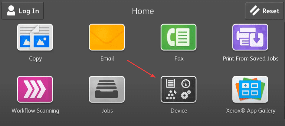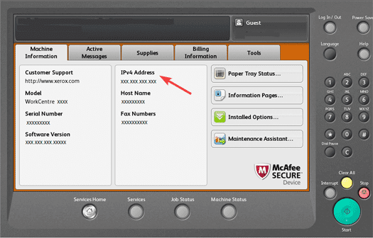 1. Start by getting the IP address of the copier. You can access the IP address by pressing the “Machine Status” button or, on other models, the “Device” option on the main menu and then “About”.