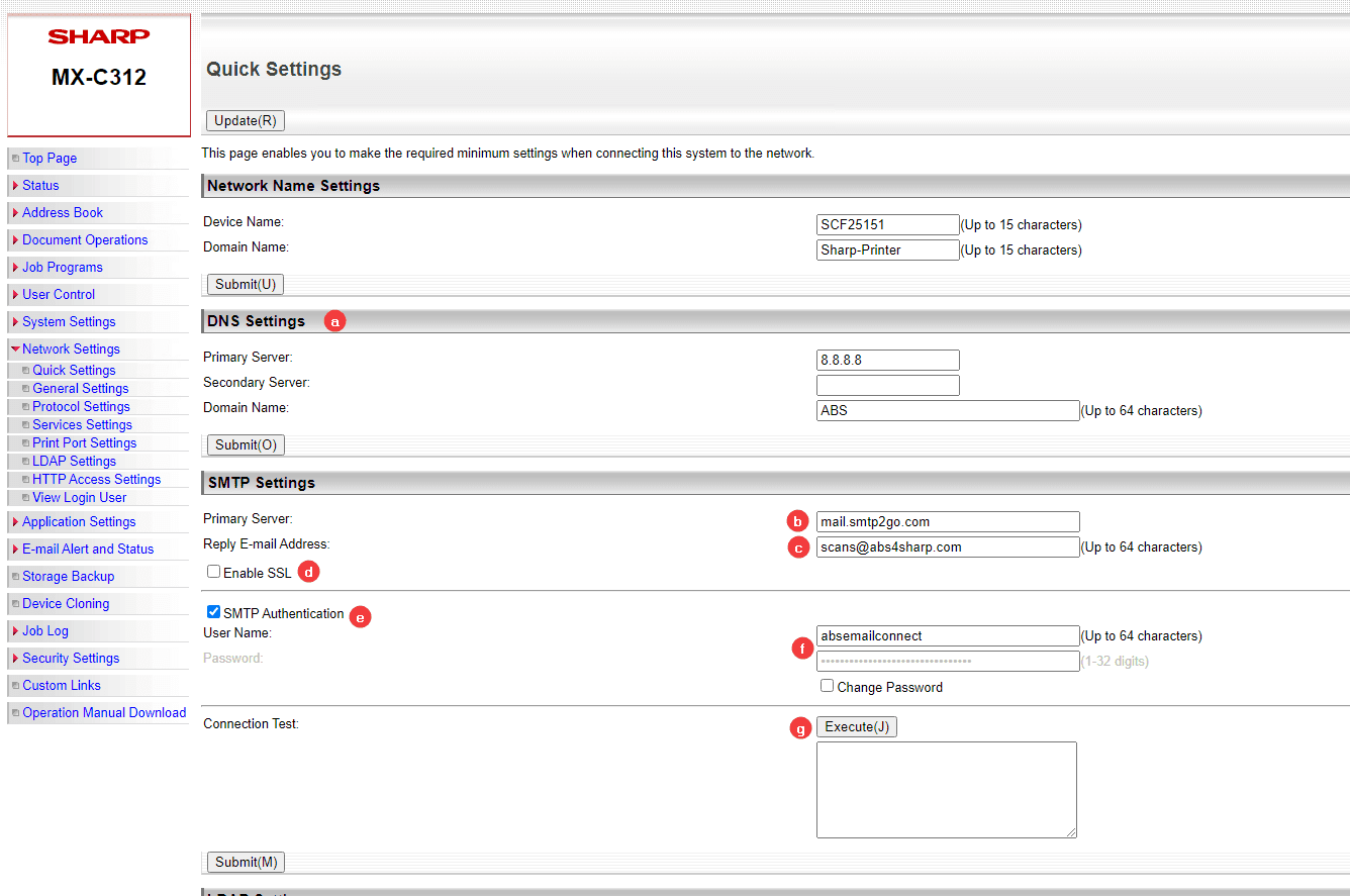4. Press the “Network Settings” option in the left column. From here follow the steps below to fill in the right information and then test the connection. Included below is a chart with email settings for common SMTP servers. If your information isn’t listed or you don’t know it you may need to reach out to your IT dept for further assistance.