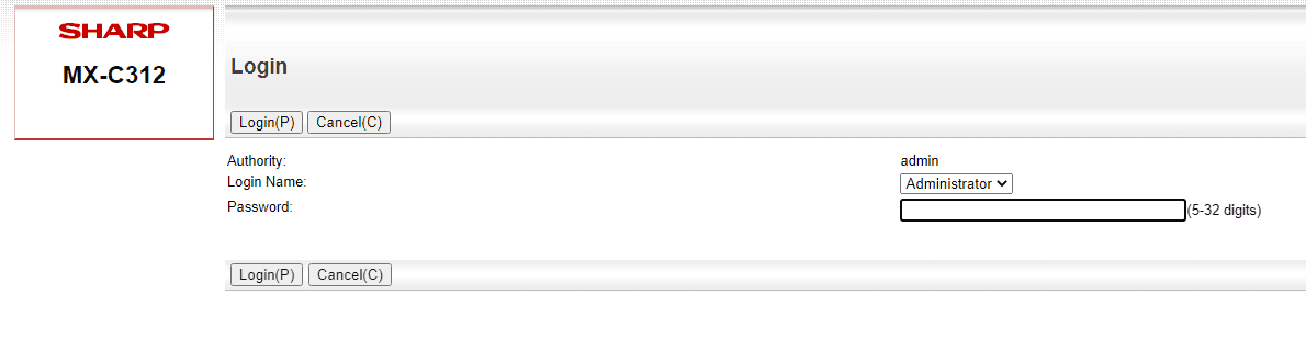 3. In the top right of the page click the “Login” option. Make sure the “Login Name” is set to “Administrator” and then input the password for the copier. The default password is admin. If this password doesn’t work you might need to check with your administrator or IT department to see if it has been changed.