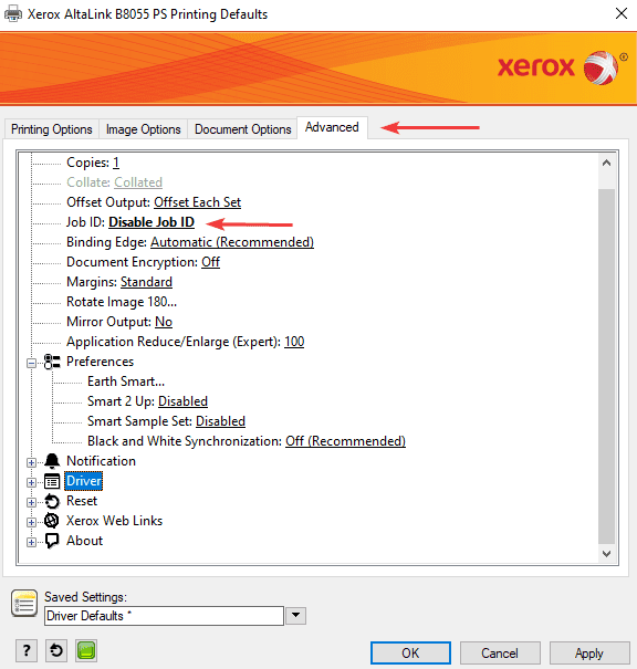6a. Go to the “Advanced” tab and next to “Job ID” click the drop-down and choose “Disable Job ID”. If this is enabled, it will print an extra page every time you send a job to the copier.