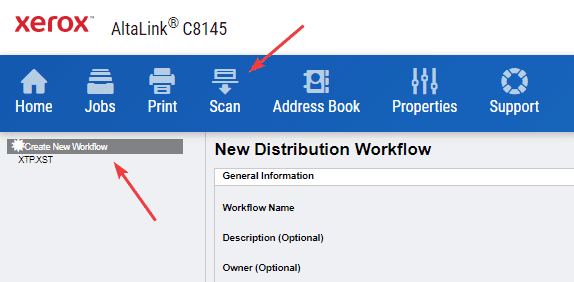 9. After signing in, press the “Scan” tab at the top of the screen and then click “Create new Workflow” or “Create new template” depending on your copier version.