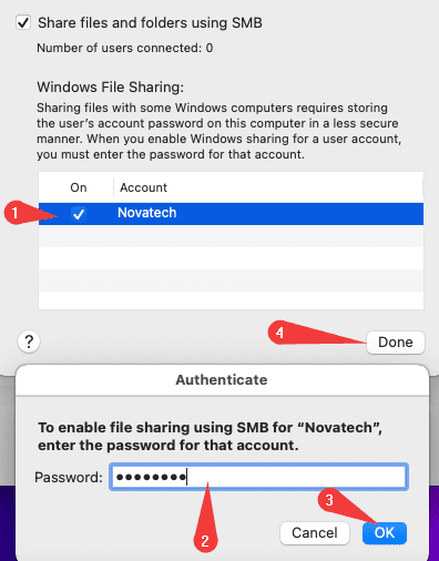 4. Tick the box next to your username under “Account”, then input your password if prompted and hit “OK”, then click “Done”.