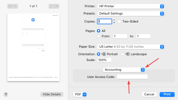 3. Make sure the correct printer is selected in the dropdown at the top and then look for the “Safari” dropdown. From here, select the “Accounting” option and then input your code.