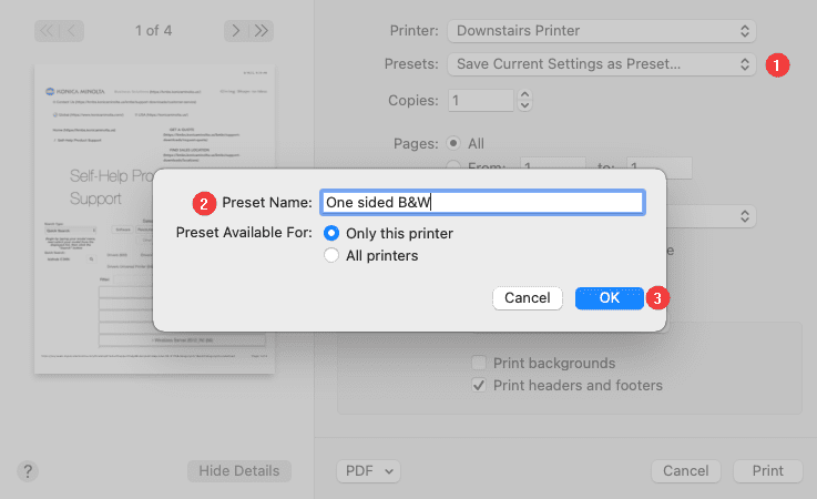 4. Once you have all of your options set, click the “Presets” dropdown at the top and choose “Save Current Settings as Preset”, give your preset a name to describe the settings you chose, and then click “OK”. Now you have a preset saved with those settings, make sure it is selected the next time you go to print next to the “Presets” option, otherwise, it will not print with your saved settings. You can now close the print option.
