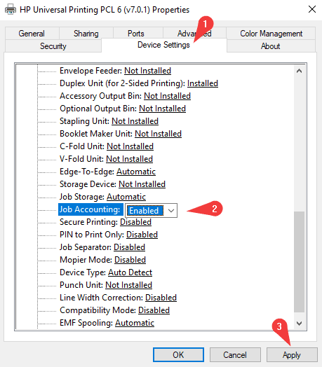 5. Go to the “Device Settings” tab and scroll to the bottom and find “Job Accounting” and enable it, then press “Apply”.
