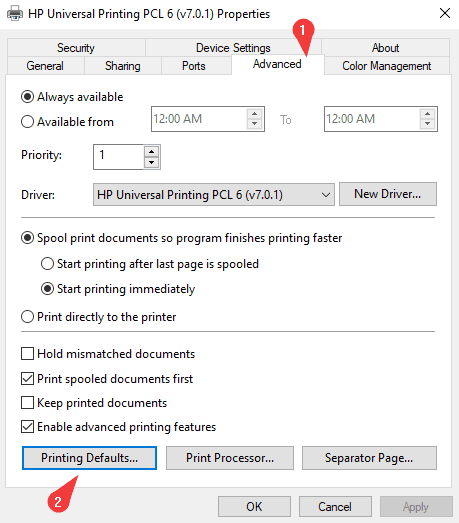 *Important* – You must have the Universal Print driver installed for the correct options to show up. To check what driver you have, go to the control panel and open devices and printers. Right-click your printer and open printer properties. On the advanced tab at the top, it will show you what driver you have installed.