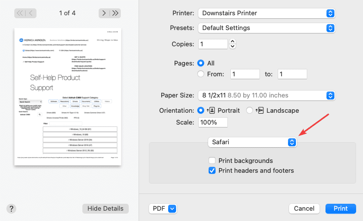 3. Make sure the correct printer is selected in the dropdown at the top and then look for the “Safari” dropdown. From here, you can select the different features to change the default options.
