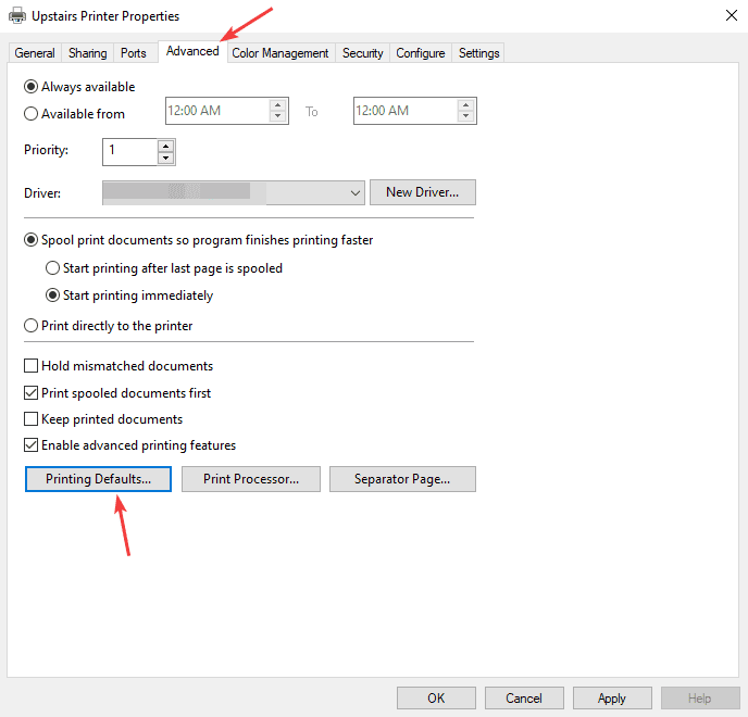 5. Go to the “Advanced” tab and click the “Printing defaults” option at the bottom left.