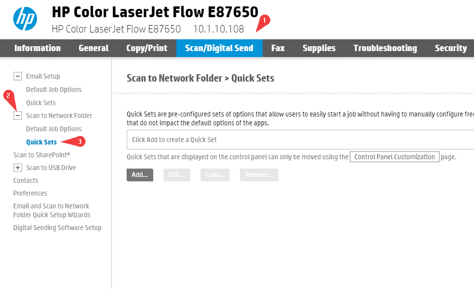 9. Click the “Scan/Digital Send” tab at the top and then, in the left column, expand the “Scan to Network Folder” option, and then click “Quick Sets”.