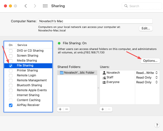 4. Tick the box next to “File Sharing”, and click the “Options” button.