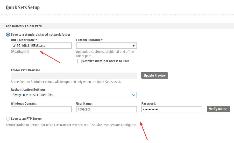 16. For the “UNC Folder Path” type “\\yourcomputeripaddress\Scans”. Drop the “Authentication Settings” down to “Always use these credentials” and then type in your username and password for the computer, then click “OK”.