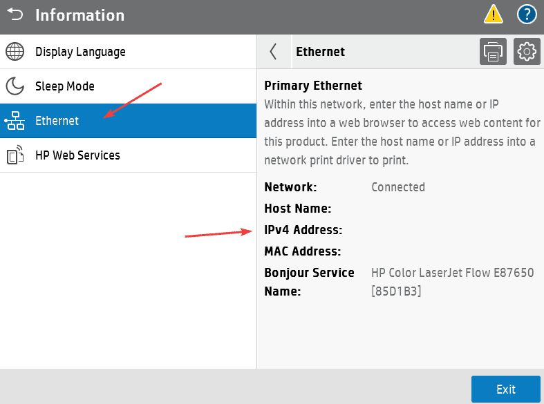 10. Go to the physical copier and press the blue “i” icon at the top of the screen, then press “Ethernet” find the “IP Address” and write it down.