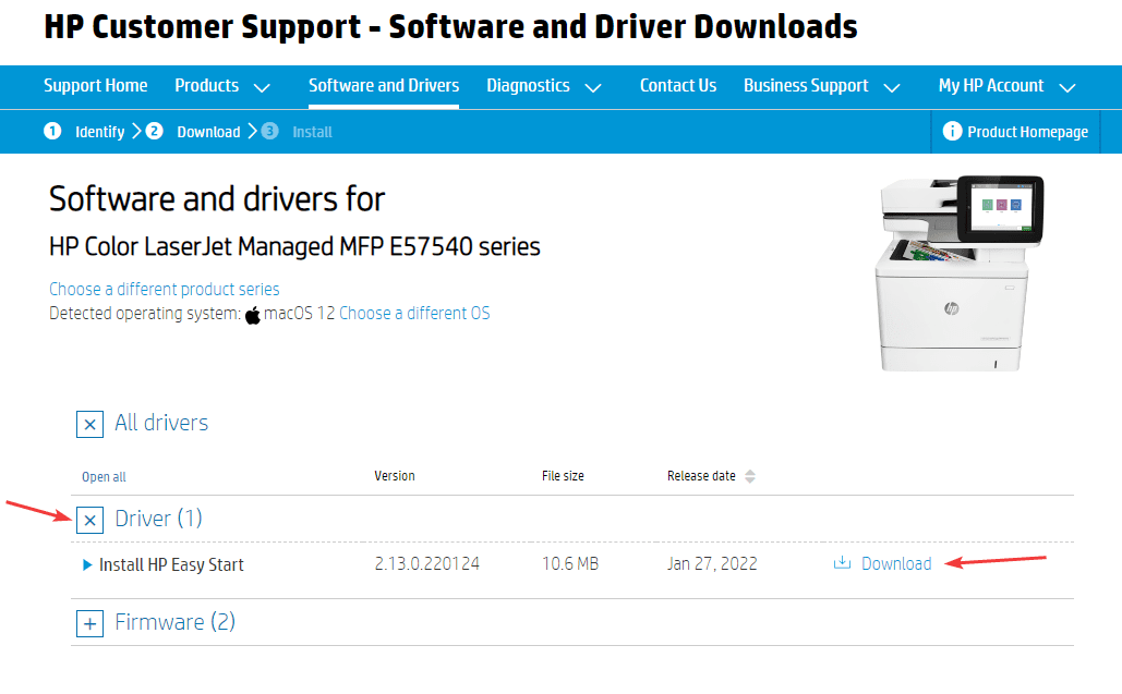 3. Make sure the correct OS is selected and then expand the “Driver” section and download the “HP Easy Start”
