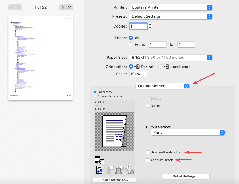 3. Make sure the correct printer is selected and then click the “Safari” dropdown, choose “Output Method” and then select “User Authentication” if you have a Username/Password for the copier and “Account Track” if you have just a pin for the copier.