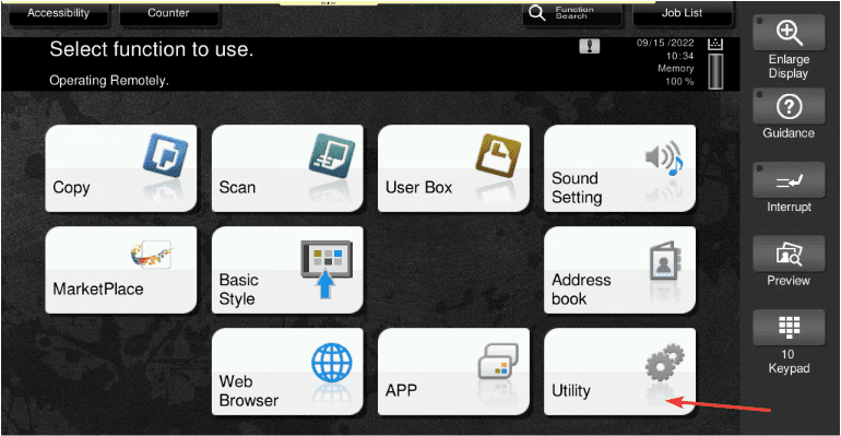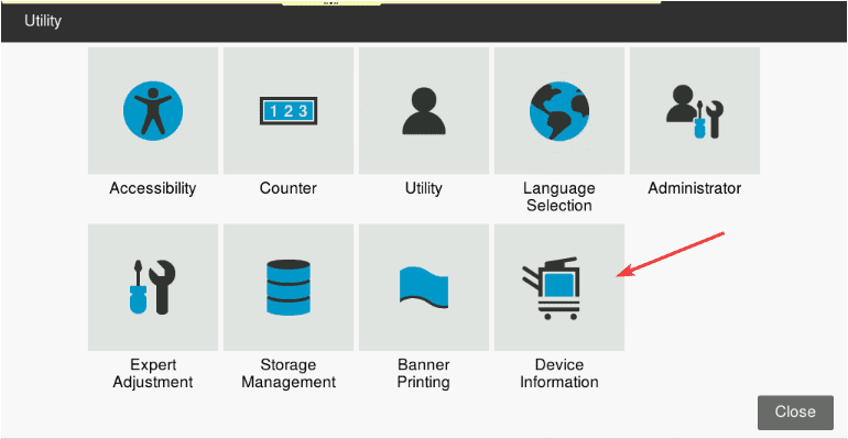 10. Go to the physical copier and press the “Menu/Home” button on the copier, then “Utility” on the screen, and finally “Device Information”. Find the IPv4 address and write it down.