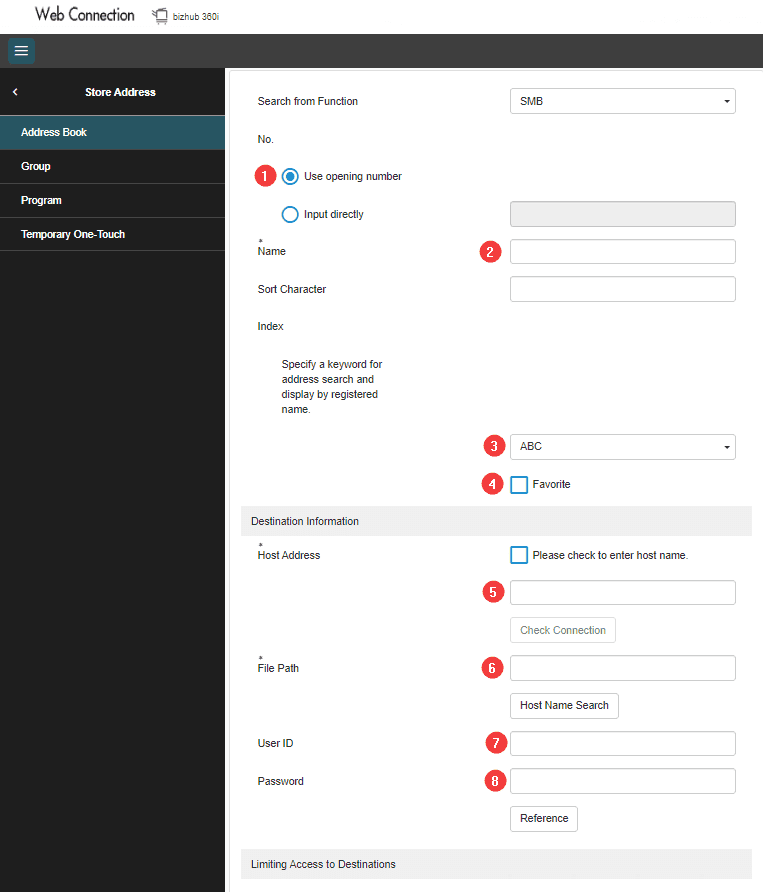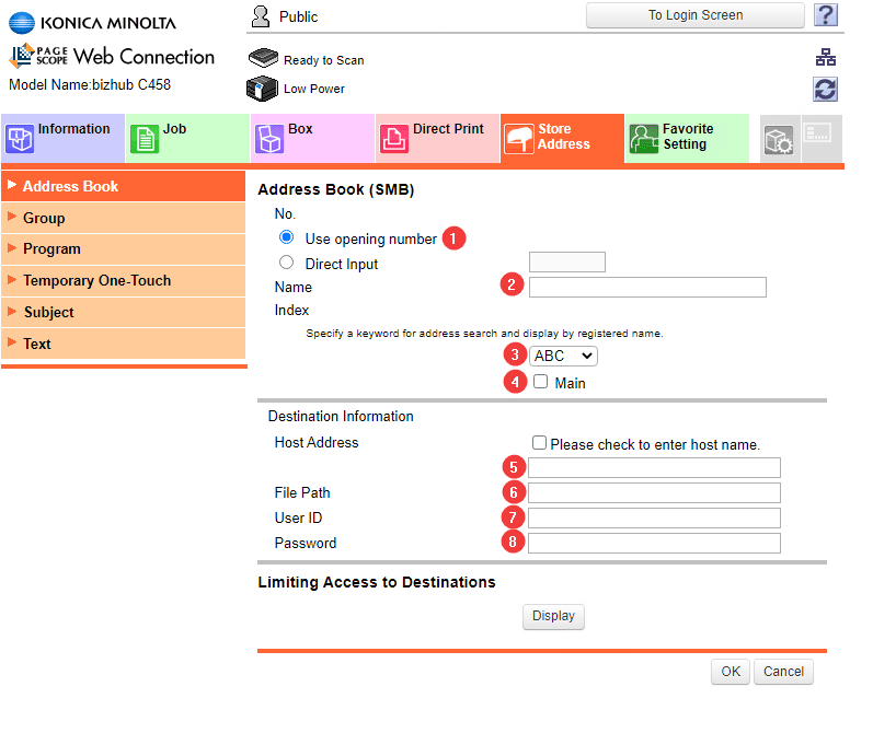13. Click the “Store Address” option, it should then by default be on the “Address Book” tab, click “New Registration”. Select the “SMB” option and follow the steps below.